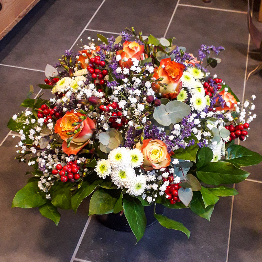 einige Beispiele für gebundene Sträuße, geschmückte Pflanzen und Schalen – gerne stelle ich Ihnen auf Wunsch ein Arangement zusammen